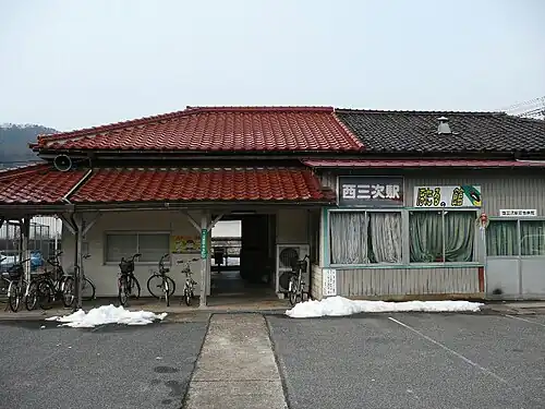 Nishi-Miyoshi Station (西三次駅, Nishi-miyoshi-eki) is a passenger railway station located in the city of Miyoshi, Hiroshima Prefecture, Japan. It is operated by the West Japan Railway Company (JR West).[1] The station was originally opened to serve residents on the north bank of the Saijō River in the former Miyoshi town in Futami District.