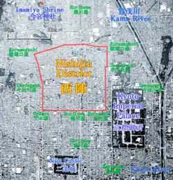 According to the Kyoto Goyakusho muke Taigai Oboegaki (京都御役所向大概覚書, Guidebook for the Kyoto Town Magistrate's Office), compiled in around 1717, Nishijin was constituted of the area covered by the Horikawa street, Shichihon-matsu street, Kuramaguchi street, and Ichijō street (or Nakadachiuri street).[5]