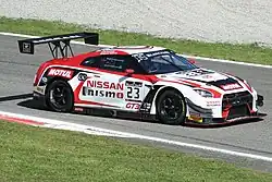The GT-R Nismo GT3 made its Super GT debut in 2012 at the Okayama International Circuit, with drivers Katsumasa Chiyo and Yuhi Sekiguchi. The car won its first race in the fourth round of the season at Sportsland Sugo, and also scored a podium finish in the following round at Suzuka. It was 4th in the final standings.[26] A couple of difficult seasons followed, in 2013 the car failed to score a single podium finish, in 2014 it only managed to win a race.[27][28] But in the 2013 JAF Grand Prix, team NDDP Racing, with driver Daiki Sasaki won the first race, starting from pole position. In the second race, the car only managed to finish 7th, and ended up being the runner-up of the 2013 JAF Grand Prix. It set the fastest laps in both races, as Nismo Athlete Global Team and NDDP Racing set the fastest laps of the first and second races respectively.[29] The car bounced back in the 2015 season, team Gainer No.10 car, driven by André Couto won the championship, scoring 2 race wins and 4 podium finishes. Including the results of team NDDP Racing, the car finished the season with a total of 4 race wins and 7 podium finishes.[30]