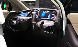 The Land Glider, a narrow-track vehicle, looks and feels like a mixture between a car, a motorcycle, and an airplane. The rear-view mirrors have been replaced by cameras and monitors.[1] Inside, the traditional steering wheel is replaced with something similar in appearance to an aircraft's yoke control. Riding on a motorcycle-inspired Tandem architecture, the Land Glider and its tires can lean up to 17 degrees in turns. Power comes from two electric motors connected to lithium-ion batteries mounted underneath the floor. The Land Glider features a non-contact charging system that enables it to be recharged at any wireless charging station.[2][3]
