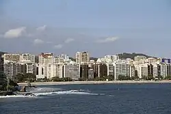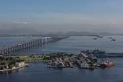 Niterói (Portuguese pronunciation:[niteˈɾɔj]) is a municipality in the state of Rio de Janeiro, in the southeast region of Brazil. It lies across Guanabara Bay, facing the city of Rio de Janeiro and forming part of the Rio de Janeiro Metropolitan Area.[3] It was the capital of Rio de Janeiro, as marked by its golden mural crown, from 1834 to 1894 and again from 1903 to 1975. It has an estimated population of 515,317 inhabitants (2020) and an area of 129.375 km2 (49.952 sq mi), making it the fifth most populous city in the state. It has the highest Human Development Index in the state and the seventh highest among Brazil's municipalities in 2010.[4] Individually, it is the municipality with the second highest average monthly household income per capita in Brazil[5] and appears in 13th place among the municipalities of the country according to social indicators related to education.[6] The city has the nicknames of Cidade Sorriso (Smile City).[7]
