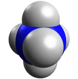 Nitrogen pentahydride, also known as ammonium hydride is a hypothetical compound with the chemical formula NH5. There are two theoretical structures of nitrogen pentahydride. One structure is trigonal bipyramidal molecular geometry type NH5 molecule. Its nitrogen atom and hydrogen atoms are covalently bounded, and its symmetry group is D3h.[1] Another predicted structure of nitrogen pentahydride is an ionic compound, composed of an ammonium ion and a hydride ion (NH4+H−). Until now, no one has synthesized this substance, or proved its existence, and related experiments have not directly observed nitrogen pentahydride. It is only speculated that it may be a reactive intermediate based on reaction products. Theoretical calculations show this molecule is thermodynamically unstable.[4] The reason might be similar to the instability of nitrogen pentafluoride,[5] so the possibility of its existence is low. However, nitrogen pentahydride might exist in special conditions or high pressure. Nitrogen pentahydride was considered for use as a solid rocket fuel for research in 1966.[6]