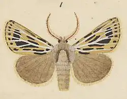The expansion of the wings of the male is almost 1 1⁄4 inches. The forewings have the costa almost straight, the apex rather acute and the termen obliquely rounded; bright ochreous with the veins heavily marked in clear white and with black markings between the veins; a small black spot at the base; an elongate blotch between vein 1 and the dorsum; two elongate marks between veins 1 and 2; wedge shaped marks at the origins of veins 2, 3, 4, and 5; a large blotch between veins 5 and 6; a much smaller blotch between veins 6 and 7; two obscure elongate marks in disc immediately below middle of costa and two obscure blackish lines between the costal and subcostal veins; a curved series of subterminal spots and a series of elongate terminal marks. The hind-wings are greyish-brown. The cilia of all the wings are whitish-ochreous. The head is pale brownish-ochreous. The thorax is densely clothed with brownish-ochreous hair with a brown horseshoe-like mark in the middle. The abdomen is pale ochreous. The antennae, which are heavily bipectinated throughout, are reddish-ochreoiis.[2]