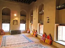 The design of the tower, complete with battlements, turret, secret shafts, false doors and wells incorporates a great deal of architectural deception.[2] Access to the top is only by means of a narrow twisty staircase[3] barred by a heavy wooden door studded with metal spikes to exhaust the enemy and impede their progress to the top of the tower. Those who did manage to run the gauntlet of hurdles risked being burnt by boiling oil or water that was poured through shafts which opened directly above each set of doors and which are called murder holes. Date syrup, a liquid that oozed from bags of dates stored in special date cellars, also came in handy as an alternative to oil and water. The fort was built above a subterranean stream that ensured a permanent supply of water when subjected to a prolonged siege. Several cisterns located within the fortified compound also ensured plentiful supplies.[5] Underground cellars stockpiled food and munitions. Running all round the summit of the tower is a wall for use by 120 guards who kept watch over the surrounding countryside and were armed with muskets and flintlocks. Furthermore, 480 gun-ports allowed for a concentrated barrage of fire if the fort came under attack.