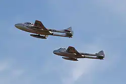 During the build-up of the RNoAF, a central part was the establishment of a fleet of jet aircraft. After rejecting the Gloster Meteor, the air force opted for the de Havilland Vampire. The first order was made on 26 January 1948. All in all Norway bought 62 Vampires, consisting of 20 Mk 3 fighter jets, 36 Mk 52 fighter-bombers and 6 Mk 55 trainers.[1] The first Vampires were delivered on 29 April 1948, constituting the start of the delivery of the Mk 3 and Mk 55s. These entered service with the 336 Squadron based at Gardermoen Air Station.[2]