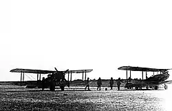 Augmented by a giant Handley Page bomber, No. 40 Wing took part in the Battle of Megiddo, General Allenby's final offensive in Palestine, where its units inflicted "wholesale destruction" on Turkish columns through sustained aerial assaults.[8][9] At Wadi Fara on 21 September 1918, the Palestine Brigade, including the 40th Wing's four squadrons, destroyed the bulk of the Turkish Seventh Army as it attempted to cross the Jordan River along an old Roman road leading from Nablus, an early demonstration of the effects of concentrated air attack on ground troops.[10] Williams wrote: "The Turkish Seventh Army ceased to exist and it must be noted that this was entirely the result of attack from the air." A detachment from No. 1 Squadron also aided Major T. E. Lawrence's Arab army north of Amman when it was harassed by German aircraft operating from Deraa.[11]