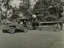 From 21 July 1944, No. 78 Squadron supported the US military's offensive through western New Guinea. The squadron again operated with US Navy PT boats during strikes on Japanese positions in the Vogelkop Peninsula and shipping in Geelvink Bay during July; these operations were undertaken to support the US Army landing at Sansapor on 30 July.[19][21] Many of No. 78 Wing's pilots completed their nine-month operational tour during July and were replaced by inexperienced pilots.[22] During the first three weeks of August the squadron flew patrols over the beachhead at Sansapor.[19] The intensive operations over Sansapor were trying, with the official history stating that No. 78 Wing was "pushed almost to the limit of its operational capacity"; two No. 78 Squadron aircraft were lost during this period.[23] No. 78 Wing attacked Japanese airfields in the Vogelkop Peninsula throughout September, and No. 78 Squadron flew 363 sorties against these targets.[24] The squadron also struck airfields on the Bomberai Peninsula as well as Japanese shipping in the easternmost islands of the Netherlands East Indies (NEI) during the last months of 1944. These operations were undertaken to support the American landings in the Philippines, which began in October, and often involved lengthy flights.[25] No. 10 (Operational) Group was redesignated the First Tactical Air Force on 25 October; at this time No. 78 Squadron remained part of No. 78 Wing alongside No. 75 and No. 80 Squadrons.[26] No. 78 Squadron aircraft began staging through airfields on Morotai from early December, and moved to the island between 21 December and January 1945.[27] During November, Len Waters, the only known Aboriginal Australian fighter pilot of World War II, was posted to No. 78 Squadron. He remained with the unit until the end of the war and completed 95 combat sorties.[28][29]