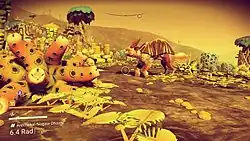 The player must assure the survival of the Traveller, as many planets have dangerous atmospheres such as extreme temperatures, toxic gases, and dangerous storms.[14] Though the player can seek shelter at alien bases or caves, these environments will wear away at the exosuit's hazard protection module and can kill the Traveller. Thus the player must collect resources necessary for survival. By collecting blueprints, the player can use resources to craft upgrades to his exosuit, multitool, and spacecraft to make survival easier, with several of these upgrades working in synergistic manners to improve the survivability and capabilities of the Traveller.[6] Each of these elements have a limited number of slots for both upgrades and resource space, requiring the player to manage inventories and feature sets, though the player can either gain new slots for the exosuit or purchase new ships and multitools with more slots.[16] The player may also buy additional slots for his starship or use storage augmentations. Many features of the exosuit, multitool, and spacecraft need to be refueled after prolonged use, using collected resources as a fuel source.[17][18]