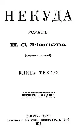No Way Out (Russian: Не́куда, romanized: Nekuda) is an anti-nihilist novel by Nikolai Leskov, published in 1864 under the pseudonym M.Stebnitsky in Biblioteka Dlya Chteniya.[1] The original epigraph ("The slow one will be God-provided, the quick one will run up himself to grab. A proverb") has been later removed. During the author’s lifetime the novel was re-issued five times: in 1865, 1867, 1879, 1887 and 1889.[2]