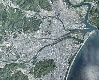 ![]() Panorama view of Agata and Nakashima, other downtown areas and the Ose River in Nobeoka, from Mount Atago. | |