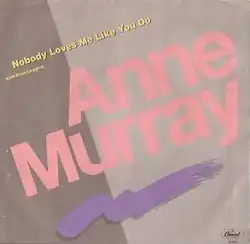 "Nobody Loves Me Like You Do" is a song written by James Dunne and Pamela Phillips-Oland, and originally performed on the CBS soap opera As the World Turns by Dunne himself with series regular Tonya Pinkins.[1][2] It was later recorded by Jermaine Jackson with a then-unknown Whitney Houston, and also by Canadian country music artist Anne Murray with singer-songwriter Dave Loggins. Jackson and Houston actually premiered their version on As the World Turns as well, on the August 1, 1984 episode,[3] while the Murray-Loggins version was released as a country single shortly thereafter, in September of '84. The former appeared on Houston's 1985 self-titled debut album and on the 2009 compilation album, The Collection.[4] The latter was the first single from Murray's album Heart Over Mind, peaking at number one on December 15, 1984. It was Murray's ninth American number-one country hit, and it also hit the top ten on the Billboard Adult Contemporary chart.[5] The song was Loggins' only hit on the country chart. In live performances, Murray sang the duet with Billie Hughes.[6] The song also appears on Murray's 2007 album Anne Murray Duets: Friends & Legends, performed as a duet with her daughter, Dawn Langstroth.
