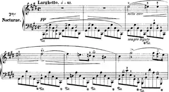 Blair Johnston calls the main cadence, near the end of the piece, "one of the most glorious moments in Chopin's entire output".[4] Johnston also calls the piece "one of [Chopin's] most graceful essays in fioritura ornamental practices".[4] Huneker states that the piece "really contains but one subject, and is a song of the sweet summer of two souls, for there is obviously meaning in the duality of voices."[7] The piece contains a harmony of broken chords which is played with the left hand, a habit Chopin had when composing his nocturnes,[8] while the right hand plays the main melody, often with the addition of a second voice. Various sections consisting of grace notes and polyrhythms add to the delicate and somewhat melancholic mood that the piece conveys.