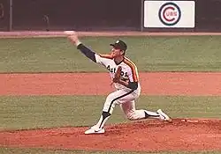 Ryan was a right-handed power pitcher who consistently threw pitches that were clocked above 100 miles per hour (161 km/h). He maintained this velocity throughout his pitching career, being known as one of the top pitchers in Major League Baseball into his mid-40s. Ryan was also known to throw a devastating 12–6 curveball at exceptional velocity for a breaking ball.[2]