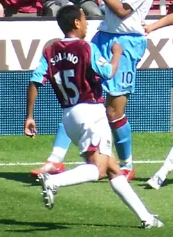 Solano signed a one-year contract with West Ham United in August 2007.[38] He made his debut for West Ham in October 2007, coming on as a second-half substitute in the 3–1 home win against Sunderland, and was instrumental in West Ham's second goal, his shot being deflected into the Sunderland goal by goalkeeper, Craig Gordon.[39] His first goal for West Ham was a free-kick and the fifth goal in West Ham's 5–0 away win against Derby County on 10 November 2007.[40] In the last game of the season on 11 May 2008 Solano scored his second free-kick goal, against Aston Villa, the match ended 2–2. He was released by West Ham when his contract expired at the end of the 2007–08 season having scored four goals in 23 appearances.[41]