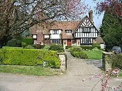 The Old Malthouse on Sandwich Road, dated 1704, is of brick and rendered timber frame construction under a hipped, thatched roof. A feature is the thatched hoist housing roof. Adjoining the original building are early 19th century extensions of brick under tiled and pantiled roofs.[48] At the junction with Mill Lane stands the early 19th century, Lime Tree Cottage with weather boarded side elevations and a front facade of imitation ashlar masonry.[49] In Mill Lane are a pair of gabled cottages by architect, George Devey for William Oxenden Hammond. Tall Chimneys and Bramley Cottage were built in 1878–9 of stone and red brick with blue diaper pattern; roughcast upper and exposed timber to front gable.[50] In the same style is Red Tiles on Beauchamps Lane, now converted to a single dwelling.[51][52] Southdown Cottage dates from the 13th century and merits a Grade II* listing. It is in the form of a hall house and is of plaster panel and timber frame construction with a thatched roof.[53]