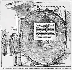The placard recorded that the Nooksack tree produced 96,345 board feet of the "finest quality" lumber.[5] The New York Times regarded the tree in a March 7, 1897 issue as the "most magnificent fir tree ever beheld by human eyes" and called its destruction a "truly pitiable tale" and a "crime".[5][6] The Morning Times of February 28, 1897 claimed that the wood, sawed into one-inch strips, would reach from "Whatcom [the tree's location] to China".[7]