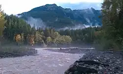 The South Fork Nooksack River, about 50 miles (80 km) long, rises in southern Whatcom County, east of Twin Sisters Mountain near Bell Pass and Lake Wiseman.[8] It flows briefly south, entering Skagit County, then northwest to re-enter Whatcom County. It flows past the town of Acme, and due north until merging with the North Fork near the State Route 9 bridge, 1.6 km (1 mi) southeast of Deming and the Nooksack Indian Reservation.