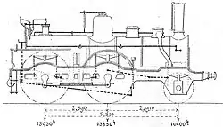 The first series, Nord 2.821–2.832, designed by L. Beugniot as 2-4-0 locomotives, was built by André Koechlin & Cie in Mulhouse in 1870–1871.[1] The locomotive had a double frame with two driving axles and a leading axle which had a clearance of 10 mm (0.39 in) on each side.[2] The firebox had an arced top and sat between the two driving axles. The tubes had a length of 3.17 m (10.4 ft) and the boiler barrel consisted of two boiler shells, with a boiler pressure of 8.5 kg/cm2 (0.834 MPa; 121 psi). The dome was placed centrally on top of the firebox and a Crampton-type steam regulator was placed on the extreme front of the first boiler shell. The cylinders were installed horizontally without inclination inside of the frame and had a Stephenson valve gear. The two-axle tender used had a capacity of 8 m3 (280 cu ft) water and 3 t (6,610 lb) coal and weighed a total of 21.6 t (47,600 lb).