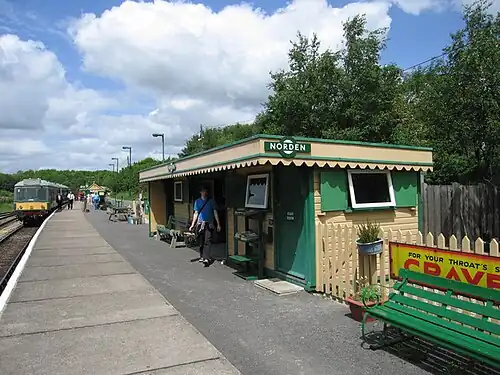 Norden railway station is a railway station located one mile to the north of the village of Corfe Castle, on the Isle of Purbeck in the English county of Dorset. It is situated on the Swanage Railway, a heritage railway that operates over the former London and South Western Railway line from Wareham to Swanage. Norden is the northern terminus of the railway's steam service from Swanage.