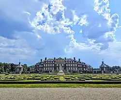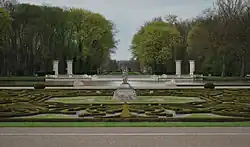 The garden front gives onto a landscaped park of some 170 hectares, reached through a formal parterre of scrolling broderie on axis, flanked by expanses of lawn. The gardens and the surrounded woods are peopled with a multitude of lifesize marble statues, of which the first deliveries were made in 1721 by the Munich sculptor Johann Wilhelm Gröninger. Other sculptures were delivered by Panhoff and Charles Manskirch. Further sculptures were added during the restoration in neo-Baroque style, undertaken in 1903–07.