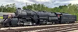 Other modifications made for the Y6bs included roller bearings for all of the tender axles, a larger diameter smokestack, and a manual reducing valve to switch the mallet between simple and compound operations at any speed.[18][20] The Y6bs still retained some features that were previously applied to their predecessors, including a boiler pressure of 300 psi (2.07 MPa), 58-inch (1,500 mm) diameter driving wheels, and tenders that held 30 short tons (60,000 lb) of coal and 20,000 US gallons (76,000 L) of water.[18][20] The final Y6b, No. 2200, was completed in April 1952; three years after Baldwin Locomotive Works built the final domestic steam locomotive in the United States.[18]