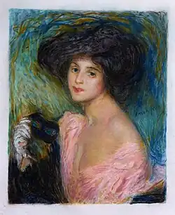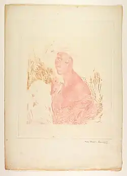 Nori Malo-Renault produced etchings in color,[3] by printing successively inked matrix of the different colors onto the paper in correct alignment to provide the color print, this is called the printing registration. For example for the print of La Femme au masque after a pastel by Edmond Aman-Jean whose five plates of copper (one by color) are kept in Paris at the Chalcographie du Louvre.