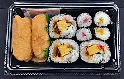 The combination of inarizushi (稲荷寿司) and makizushi is a common kind of bento, and called sukeroku (助六), a pun on the kabuki play with the same title. In the lineup of nigirizushi, although sweet egg (玉子) usually has a black belt of nori, it is categorized as nigirizushi.[9]
