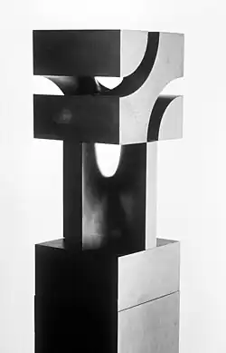 Carlberg's sculptures often consist of repetitions of such a unit, a basic shape capable of combining with other such elements in various ways—somewhat in the way a composer such as Bach or Webern might compose a piece of music by exploring the combinatorial possibilities of a single motivic cell, working within implicit constraints. At Yale, Erwin Hauer was an important influence who prodded Carlberg in this stylistic direction. While both men often employed curvilinear forms as modules, Carlberg more often used relatively geometric, hard-edged design units, often combining curves with straight edges (or flat planes) in the same module. His prints, mostly dating after 1970, show a similar preoccupation with precision, simplicity, and modularity. Some are actually groups of prints, placed contiguously together on a wall, with each print conceived as a module.[9]