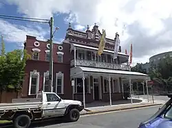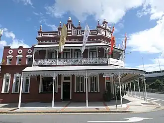 The hotel addresses both street frontages and has a main entrance on the Ipswich Road and a corner entrance to the public bar. It is confident and flamboyant in style with an ornate parapet concealing a hipped roof, which is clad in corrugated iron and pierced by tall brick chimneys. The ground floor awning and the verandah to the upper floor feature curved corrugated iron roofs supported on slender cast iron columns. Each is truncated at the corner following the line of the building and each is decorated with lacy cast iron valances. The upper level also has cast iron balustrading.[1]