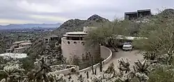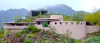 The structure is made primarily of rose-tinted concrete.[16][8] Unlike Wright's other designs, which tended to face inward or away from crowded areas, the building's windows face Downtown Phoenix to the south.[17] The facade contains steel casement windows, which were arranged so that the house's occupants could see the valley below.[13] Spread across the facade are half-moon-shaped lunette windows.[13][23] The windows are topped by ledges to prevent large amounts of sunlight from heating up the house's interior,[17] and there is a glass wall facing the patio and pool area.[5][34]