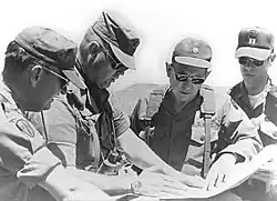In the Vietnam War, Schwarzkopf served as a task force adviser to the Army of the Republic of Vietnam Airborne Division.[20][42] He was promoted to major shortly after arriving in Vietnam. After an initial orientation at Military Assistance Command, Vietnam (MACV), headquartered in Saigon, Schwarzkopf was sent north to Pleiku in the central highlands, in the II Corps Tactical Zone.[43] He got his first combat experience on 3 August, when he was the senior adviser to a force of 1,000 South Vietnamese paratroopers sent to relieve a beleaguered South Vietnamese Army force at Đức Cơ Camp. The paratroopers took heavy casualties and a second, larger force was required to relieve them. That force too came into heavy contact. Schwarzkopf and his group fought continuously for several days. At one point, he braved heavy North Vietnamese fire to recover and treat a handful of wounded South Vietnamese soldiers and escort them to safety.[44]