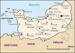 These come from the Vulgar Latin, but began only about 100 years after the fall of the Western Roman Empire, in the 6th century AD, but we don't own any document mentioning such place-names before the 8th century with Bourville (Bodardi villa in 715).[8] In this province, it is sometimes difficult to know if these formations (-ville, -val, -mont, -mesnil, etc.) are Pre-Normanic or Normanic, due to similarities between the two.
