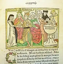 The Salerno tradition was first recorded by Amatus of Montecassino in his Ystoire de li Normant between 1071 and 1086.[14] Much of this information was borrowed from Amatus by Peter the Deacon for his continuation of the Chronicon Monasterii Casinensis of Leo of Ostia, written during the early 12th century. Beginning with the Annales Ecclesiastici of Baronius in the 17th century, the Salernitan story became the accepted history.[15] Although its factual accuracy was questioned periodically during the following centuries, it has been accepted (with some modifications) by most scholars since.[16]