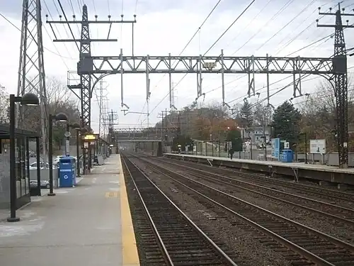 The station has two high-level side platforms that serve the outer tracks of the four-track Northeast Corridor. The northern (westbound) platform is 10 cars long, while the southern platform is 9 cars long.[5]: 20