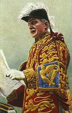 Sir Gerald Wollaston | 1944–1957 | A grandson of Sir Albert William Woods,[8] Wollaston was educated at Harrow School and then Trinity College, Cambridge, where he graduated in 1893 with a law degree.[9][10] He was called to the Bar in 1899, but joined the College three years later as Fitzalan Pursuivant Extraordinary for the coronation of Edward VII. Appointments as Bluemantle Pursuivant (1906), Richmond Herald (1919), and Norroy King of Arms (1928) followed.[9] Having served as Henry Farnham Burke's deputy for a year,[9] he succeeded him as Garter and oversaw the coronation of George VI; his experience and knowledge of ceremonial proved useful in assisting the young Earl Marshal. Earlier in his career, he was often called on to counsel in peerage cases.[10] A "most painstaking and skilled herald with special bent to ceremonial", he published The Court of Claims in 1902, 1910 and 1936.[9] After his Gartership, he served as Norroy and Ulster until his death in 1957.[10] | [9] |