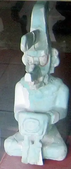Burial 85 dates to the 1st century CE,[3] in the Late Preclassic, and was enclosed by a platform, with a primitive corbel vault.[63] It was the first royal burial that characterised the shift in ceremonial focus from the Mundo Perdido complex to the North Acropolis.[9] The tomb was centrally located upon the north-south axis of the North Acropolis, under what would later become Temple 26, and contained a single male skeleton, which lacked a skull and its thighbones.[64] The dynastic founder of Tikal, Yax Ehb Xook, has been linked to this tomb, which lies deep in the heart of the North Acropolis.[65] The deceased had probably died in battle with his body being mutilated by his enemies before being recovered and interred by his followers. The bones were wrapped carefully in textiles to form an upright bundle.[66] The missing head was replaced by a small greenstone mask with shell-inlaid teeth and eyes and bearing a three-pointed royal headband.[67] This head wears an emblem of rulership on its forehead and is a rare Preclassic lowland Maya portrait of a king.[68] Among the contents of the tomb were a stingray spine, a spondylus shell and twenty-six ceramic vessels.[69]