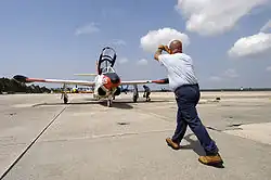 Every jet-qualified Naval Aviator and virtually every Naval Flight Officer from the late 1950s until 2004 received training in the T-2 Buckeye, a length of service spanning over four decades. The aircraft first exited the Naval Aviator strike pipeline (where it saw its final carrier landings) in 2004,[8] and the Naval Flight Officer tactical jet pipeline in 2008. In the Naval Aviator strike pipeline syllabus and the Naval Flight Officer strike and strike fighter pipeline syllabi, the T-2 has been replaced by the near-sonic McDonnell Douglas T-45 Goshawk (the U.S. Navy version of the BAE Systems Hawk), which is more comparable to other high-performance, subsonic trainers, or the supersonic U.S. Air Force Northrop T-38 Talon.[9] More recently, the T-2 has been used as a director aircraft for aerial drones. Several T-2 Buckeyes, although still retaining their USN markings, are now registered as civilian-owned aircraft with FAA "N" numbers; they regularly appear at airshows.