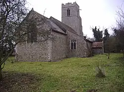 The main structure of the church is built from coursed flint with limestone quoins. The chancel and extension to the nave date from the early part of the 13th century.[6] The north aisle was added in the 15th century and is separated from the nave by a four-bay arcade with octagonal shaped piers.[6] The tower and north porch were added in the late 15th century. Within the tower there were once two bells. One was removed in 1669 when it was found to be cracked. The second was removed and transferred to Bawdeswell and installed in the new church there in the 1950s. Inside the church there are several memorials of note, the most impressive being to Sir Austin and Dame Elizabeth Palgrave[5] which is located on the wall of the north aisle. In the sanctuary there is a monument to John Palgrave[5] who died on 29 May 1611 who had been a prominent lawyer and a local magistrate in Norfolk. On the wall of the chancel there is a monument to Margaret Pope[5] the wife of Dr John Pope of Over, Cambridgeshire. She was the daughter of John and Urith Palgrave. At the eastern end of the north aisle brasses set into a stone slab to commemorate Henry Palgrave[5] who died in 1516.