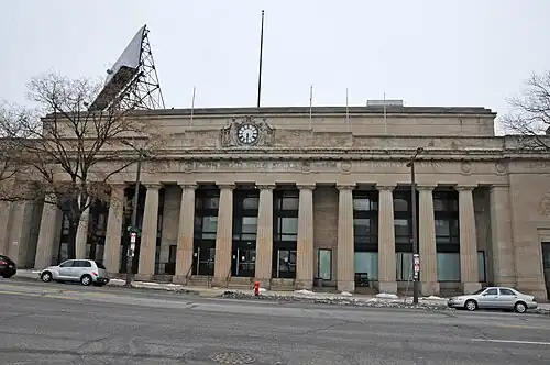 In 1928, facing competition from the impending completion of the Broad Street Line, the Reading decided to replace Huntingdon Street station with a larger station to rival the PRR's nearby North Philadelphia station. Groundbreaking for Broad Street station was held on July 31, 1928 and demolition of Huntingdon Street station began immediately.[9] The classical revival station, designed by Horace Trumbauer, opened as North Broad Street in 1929.[10] The station featured two island platforms which served all four tracks, connected by an underground walkway to the station, street, and the Broad Street Line's North Philadelphia station.[11] Its grand design reflected pre-Great Depression optimism and plans for redevelopment of the surrounding neighborhood.[10]