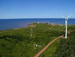 The North Cape Wind Farm is a small 16-turbine wind farm located at North Cape in the community of Seacow Pond, immediately south of the WEICan facility. The wind farm was developed in two 8-turbine phases with phase one being completed in November 2001 and phase two being completed in November 2003. The wind turbines being used are the Vestas V-47-660 model with a rated generating capacity of 660 kWh (2,400 MJ).[12] At 100% production, the 16 turbines are capable of generating 10.5600 MWh (38,016 MJ) of electrical power per year.[13]