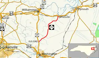 Starting from US 17, in Old Ford, this two-lane rural highway travels through the farmland of Beaufort and Martin Counties, ending in downtown Jamesville at US 64 Business.[1]