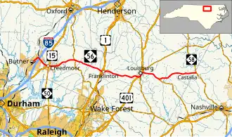 NC 56 is a predominantly two-lane rural highway connecting the three Counties of Granville, Franklin and Nash. Acting as a spur route, it begins at the intersection of Central Avenue/C Street, in Butner, and goes northeast to connect with I-85 (exit 191). Going southeasterly, it enters Creedmoor and has two brief concurrencies with US 15 and NC 50. Going in an easterly direction, it crosses NC 96, in Wilton, halfway before reaching Franklinton, where it connects with both US 1 and US 1A. Continuing east for 8.5 miles (13.7 km), it reaches Louisburg, where it has another short concurrency with US 401 and NC 39 along Bickett Boulevard. At the intersection of East Nash Street, NC 56 begin its concurrency with NC 581 to Mapleville. Continuing east for another 9.3 miles (15.0 km), it reaches its eastern terminus at NC 58, just over the Franklin/Nash County line and north of Castalia.[1]