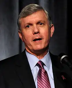 As with other state officials, only qualified voters in North Carolina are eligible to be elected lieutenant governor. Unlike most other candidates, who must be at least 21 years of age, any potential lieutenant governor—like the governor—must be at least 30 years of age.[36] They must also have been a citizen of the United States for at least five years and a resident of North Carolina for at least two years preceding election. Like the governor, the lieutenant governor is elected every four years thereafter, but is elected on their own ticket.[37] Contested elections for the office of lieutenant governor are resolved by a majority vote of the General Assembly.[38] Their term of office begins on January 1 following their election.[39] They serve for a four-year term and until their successor has assumed office.[40] The lieutenant governor is limited to serving two consecutive terms in office, with no limits on nonconsecutive terms.[41]