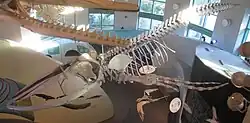 - Coastal North Carolina Overlook – Displays an array of marine mammal skeletons overlooking the "Coastal North Carolina" hall, including the museum's former mascot, a sperm whale specimen named "Trouble" that had washed ashore on Wrightsville Beach in 1928.[16] Other specimens on display include a blue whale skeleton, a rare True's beaked whale skeleton, and the skeleton of "Mayflower", a North Atlantic right whale collected in 1874 which has been on display for over a century.[15]
