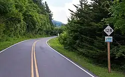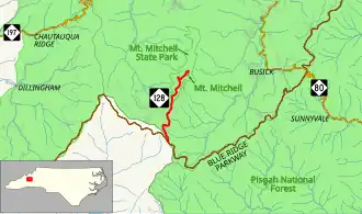North Carolina Highway 128 (NC 128) is a primary state highway in the U.S. state of North Carolina. It runs from the Blue Ridge Parkway (mile marker 355) to Mount Mitchell State Park. Reaching an elevation of over 6,400 feet (2,000 m), it is the highest (of any) road or highway east of the Mississippi River.