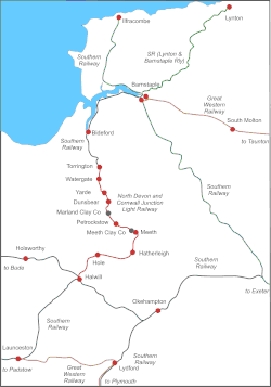 The North Devon and Cornwall Junction Light Railway was a railway built to serve numerous ball clay pits that lay in the space between the London and South Western Railway's Torrington branch, an extension of the North Devon Railway group, and Halwill, an important rural junction on the North Cornwall Railway and its Okehampton to Bude Line.