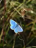Chalk grassland is found on the steep south-facing scarp slopes and the more gently graded north-facing dip slopes, where woodland is absent. The alkaline soils are thin and nutrient poor, which prevents deeper-rooted lush grasses (with a high water demand) from dominating.[20] Each square metre of chalk downland may support up to 40 different species. This semi-natural habitat is maintained through sheep, cattle and rabbit grazing which prevents scrub encroachment. Chalk grassland to the west of the Medway Valley is dominated by upright brome and fescue, whilst grassland to the east is dominated by tor-grass.[1] Owing to the close proximity of the North Downs to the European continent, the warm climate and the south-facing escarpment, several plant species survive on the chalk grassland which are scarce or not found elsewhere in the British Isles.