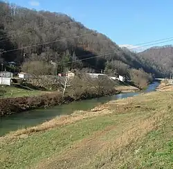 The river rises at Payne Gap in Letcher County, in the Appalachian plateaus, flowing initially westward past Whitesburg in the Kanawha section (of the Cumberland Plateau) north of Pine Mountain.[2][1][5] Several of its early tributaries flow off the north side of Pine Mountain into it, one of the principal ones being Cowan Creek.[1] The basin size within Letcher County is 131 square miles (340 km2).[1]