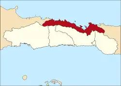 North Gorontalo (Gorontalo Utara) is a regency of Gorontalo Province, Indonesia, stretching along the entire northern coast of the province. It is located on the northern peninsula of the island of Sulawesi. It was established on 2 January 2007 under Law Number (Undang-Undang Nomor) 11/2007 from the former northern districts of Gorontalo Regency. The new regency has an area of 1,777.02 km2, and it had a population of 104,133 at the 2010 Census[2] and 124,957 at the 2020 Census;[3] the official estimate as at mid 2023 was 130,400 (comprising 66,420 males and 63,980 females).[1] Its regency seat is the town of Moluo in Kwandang District.