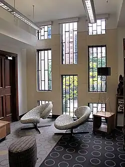The door at the main entrance is a pair of bronze doors and the bronze doorcases with moulded architraves. Another major architectural feature of the building is the double half-turn unenclosed symmetrical grand staircase outside the door that form a hexagon. On the balustrade of staircases, there is ornamental ironwork featuring with Grecian motifs. Some landings, strings, spandrels in Italianate palazzo style can also be found.
